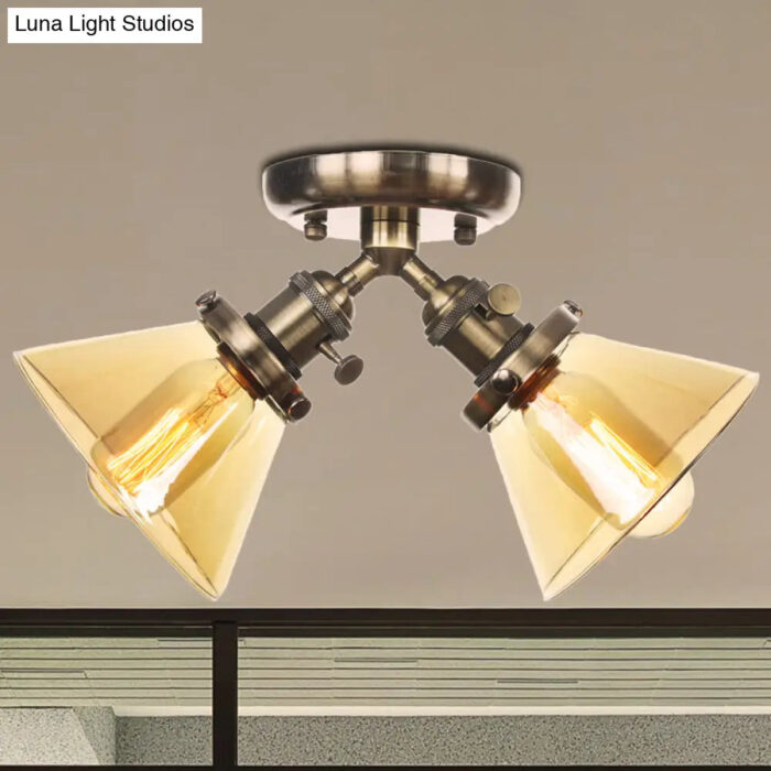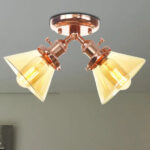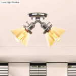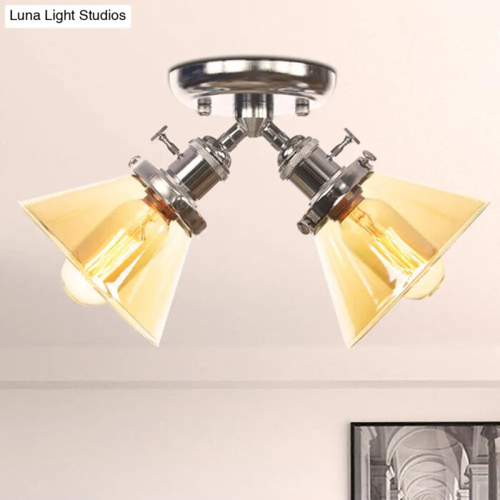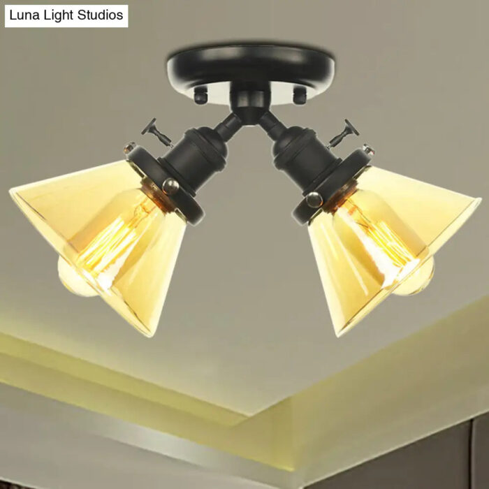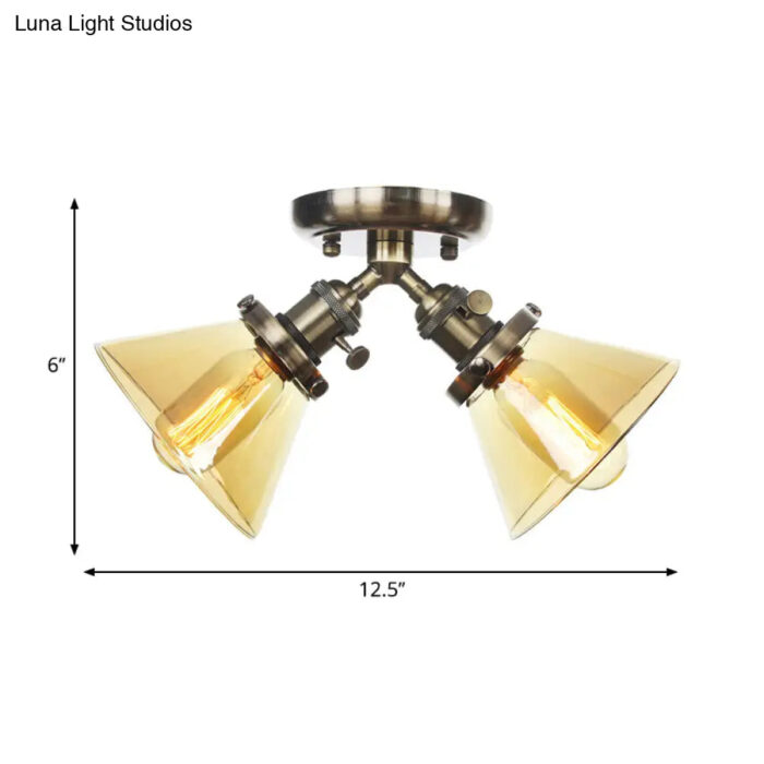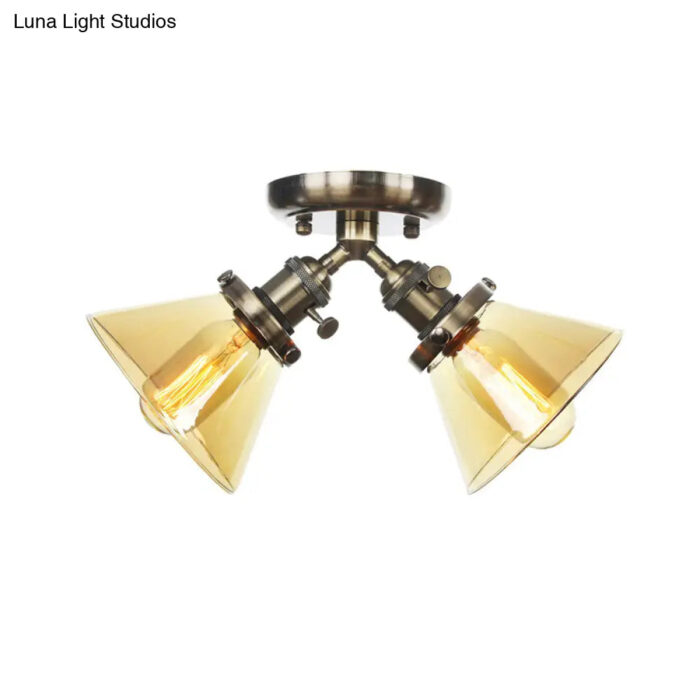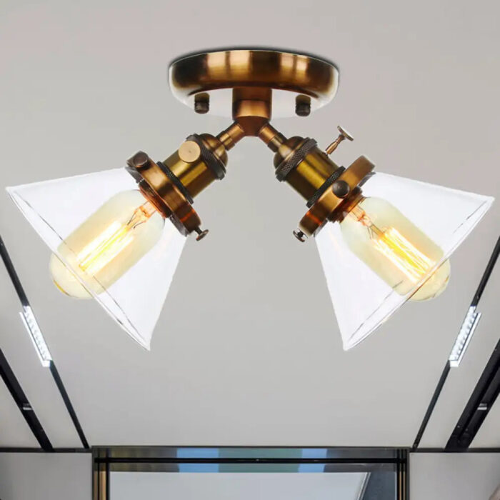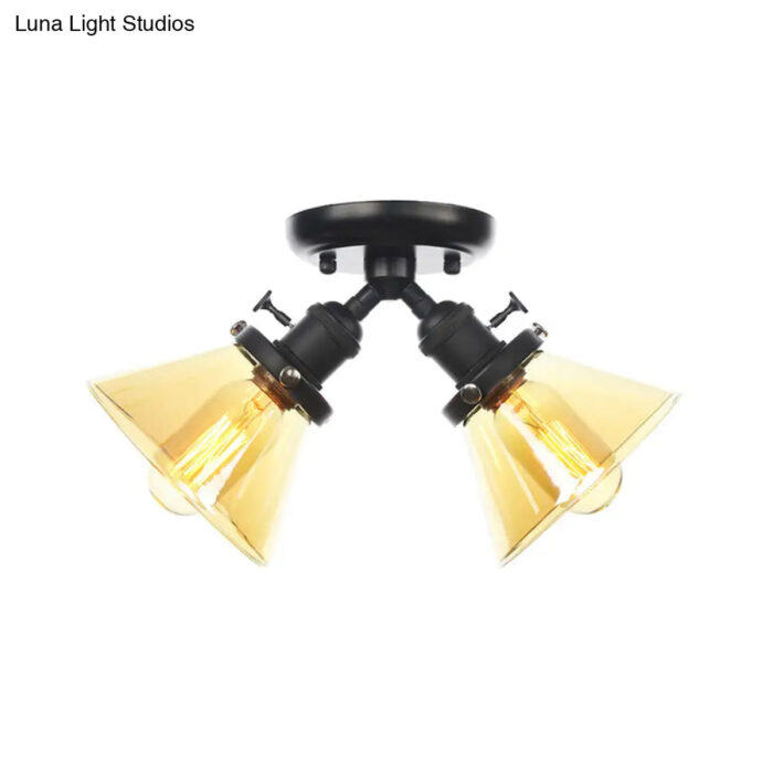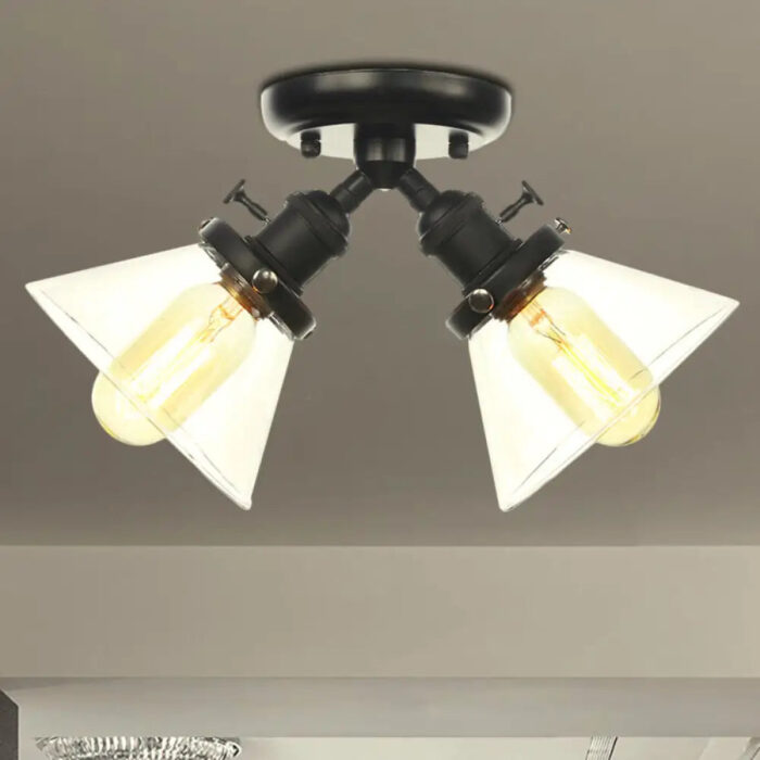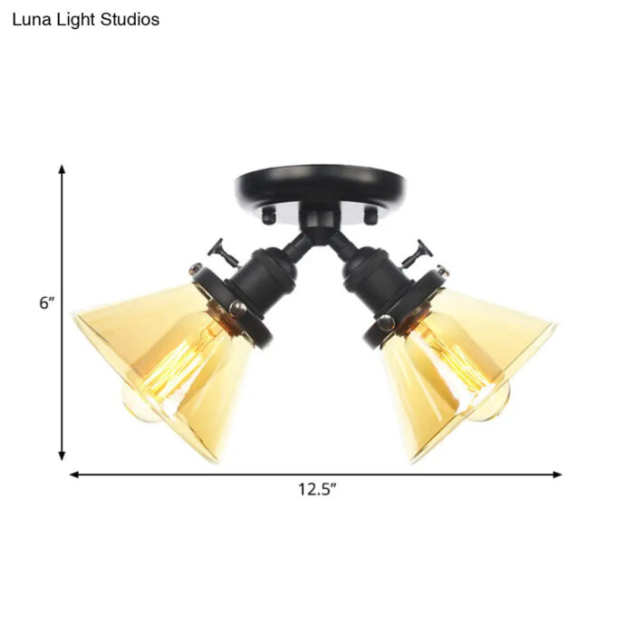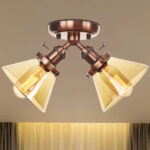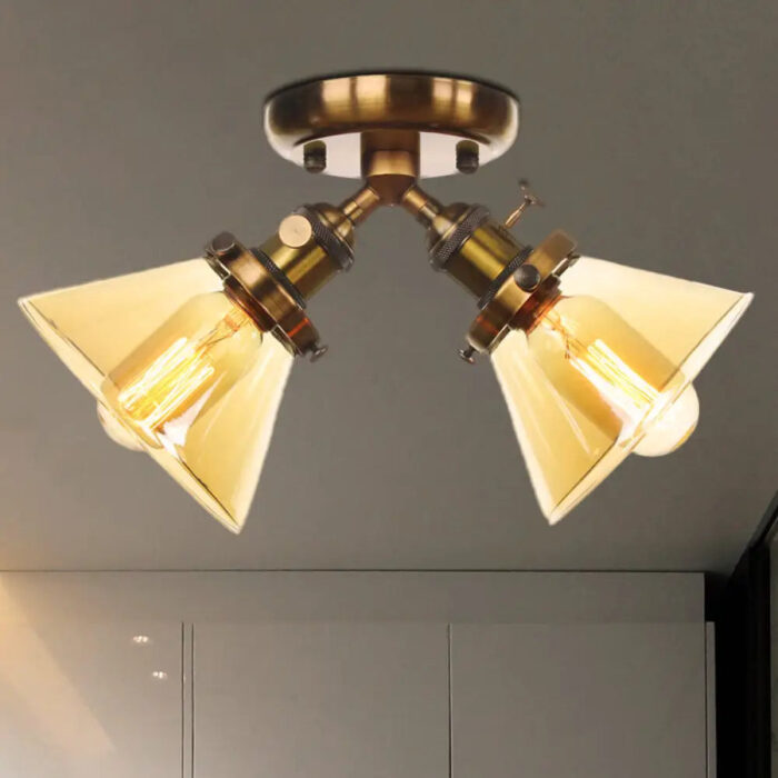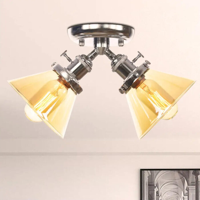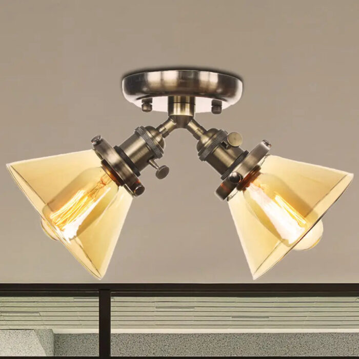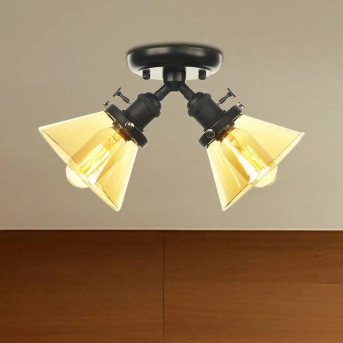 This 2 Heads Restaurant Ceiling Light Fixture is a vintage style light fixture that is semi flush mounted. It comes in black or bronze and has conic amber or clear glass shades. The light is LED, incandescent, or fluorescent. It is 110V-120V or 220V-240V. The base is E26/E27.