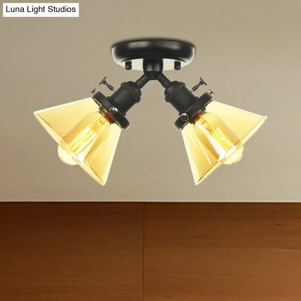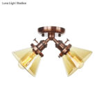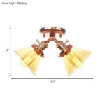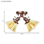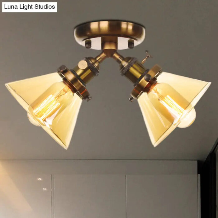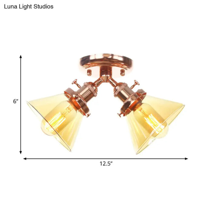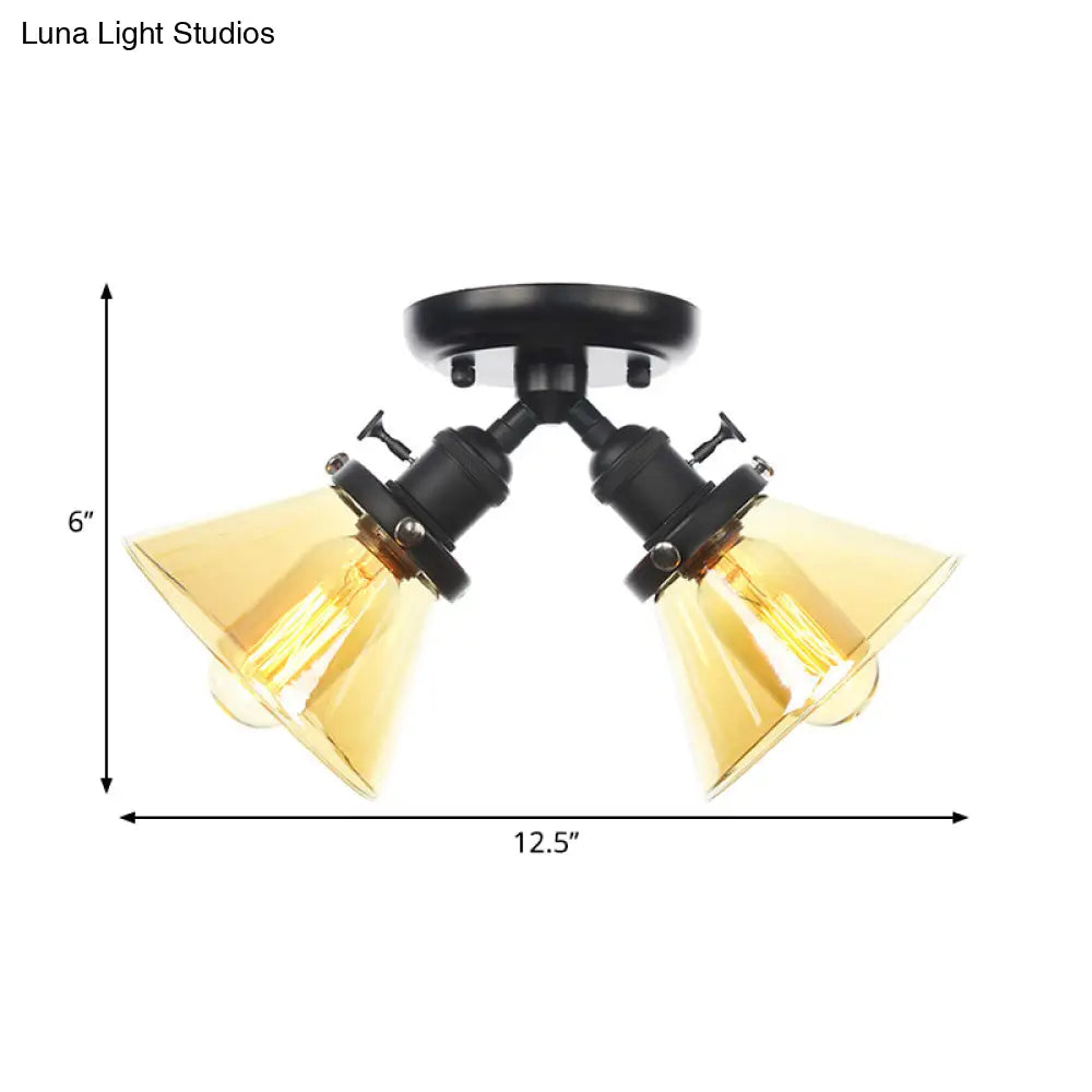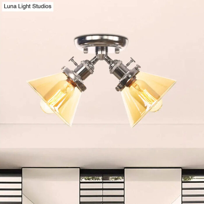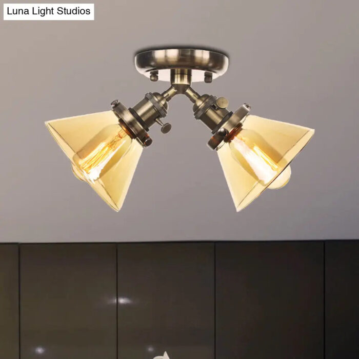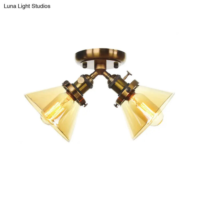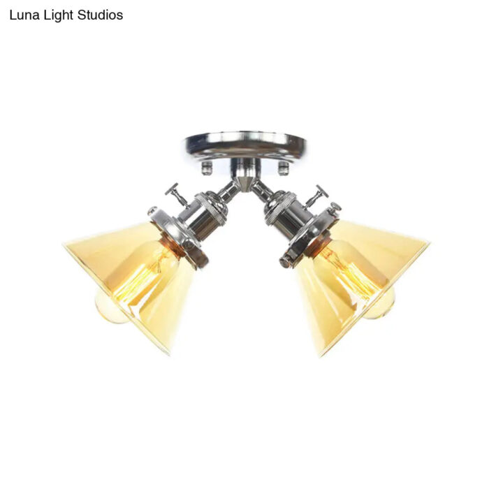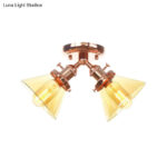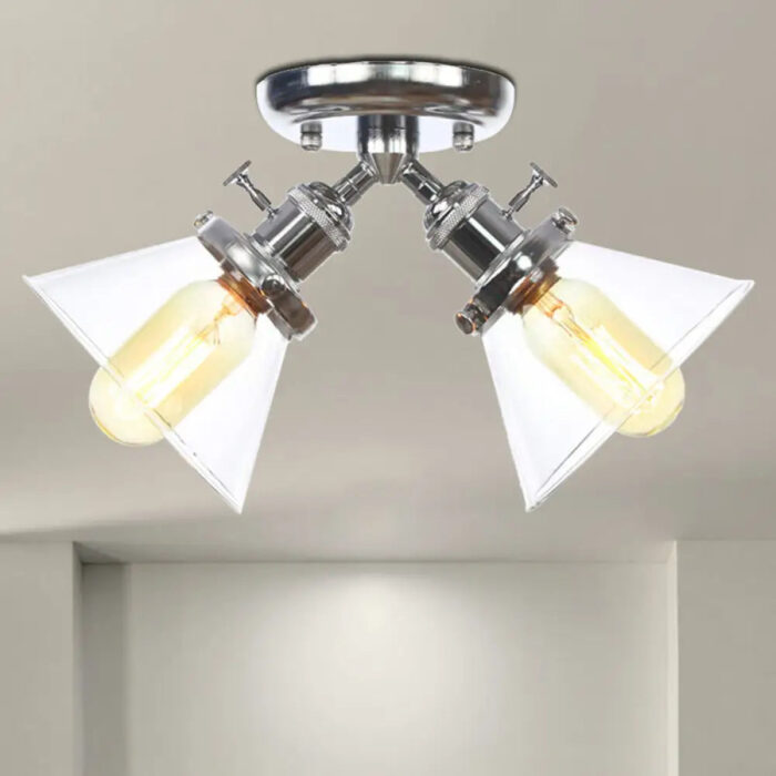 This 2 Heads Restaurant Ceiling Light Fixture is a vintage style light fixture that is semi flush mounted. It comes in black or bronze and has conic amber or clear glass shades. The light is LED, incandescent, or fluorescent. It is 110V-120V or 220V-240V. The base is E26/E27.