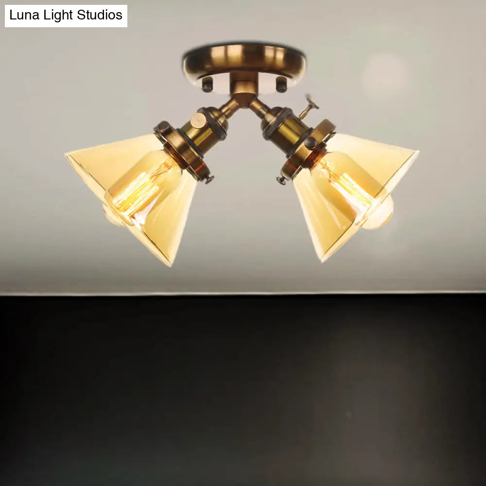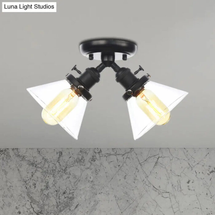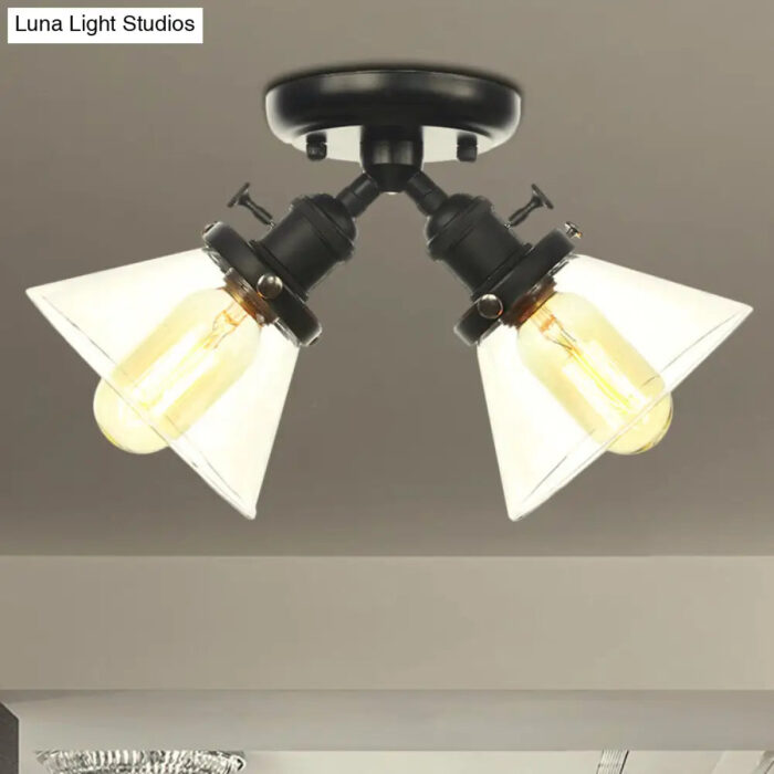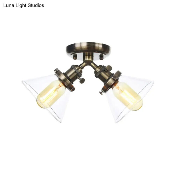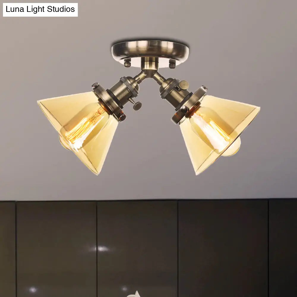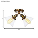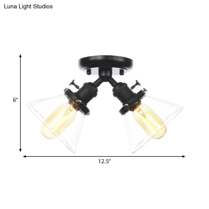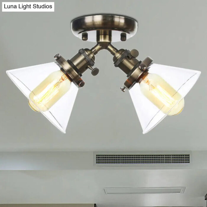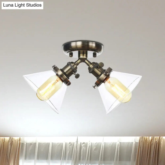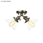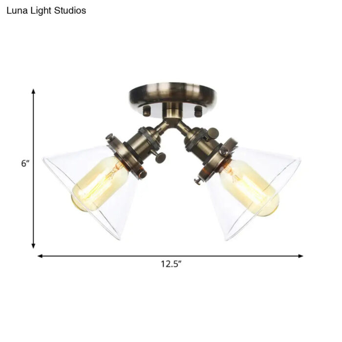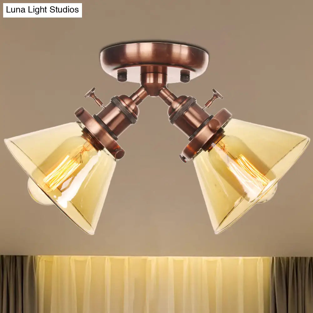 This 2 Heads Restaurant Ceiling Light Fixture is a vintage style light fixture that is semi flush mounted. It comes in black or bronze and has conic amber or clear glass shades. The light is LED, incandescent, or fluorescent. It is 110V-120V or 220V-240V. The base is E26/E27.