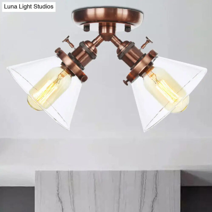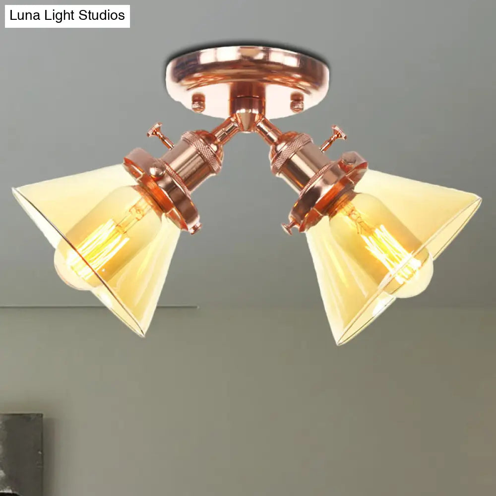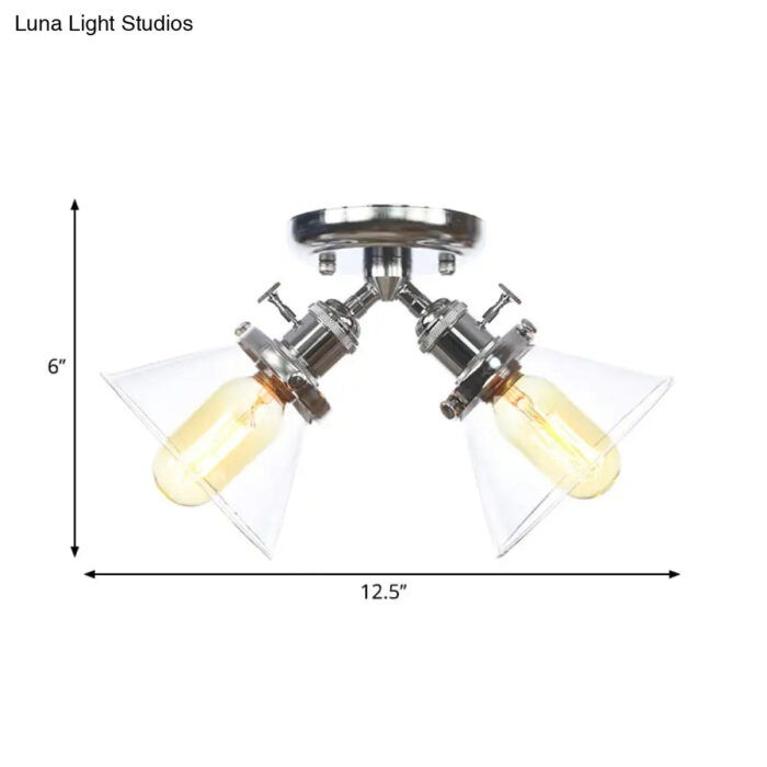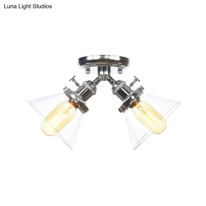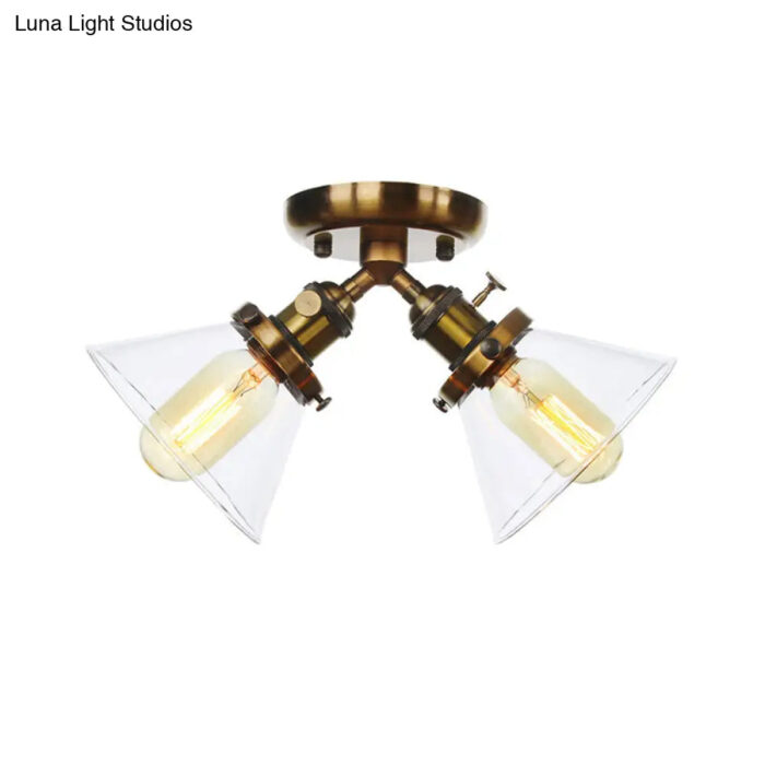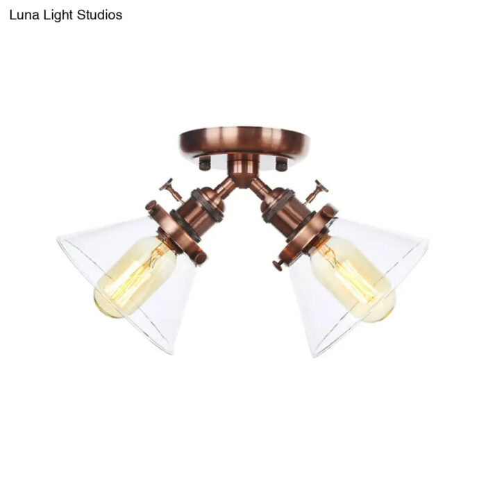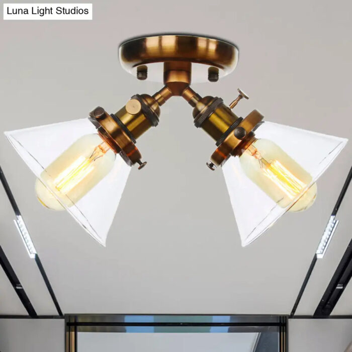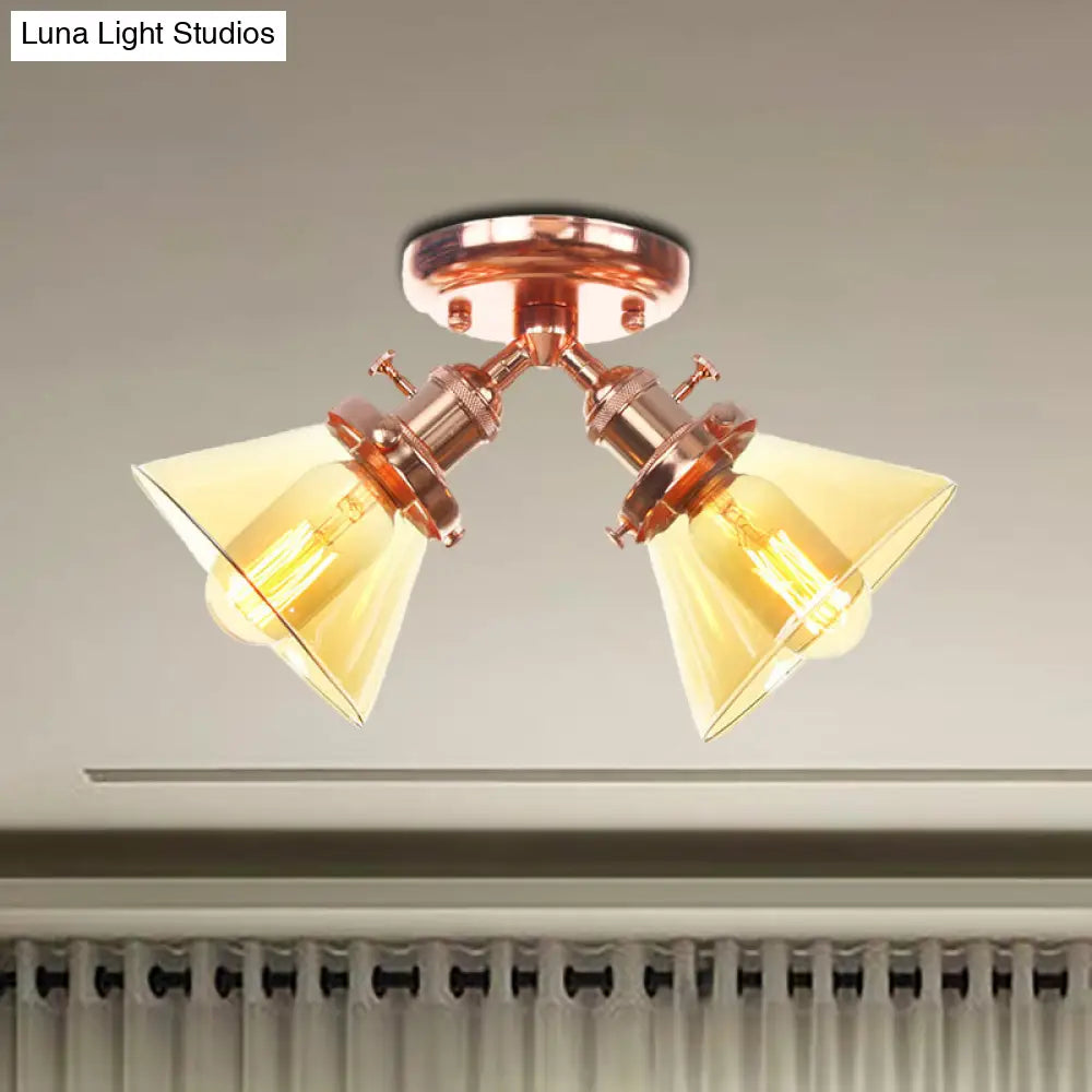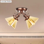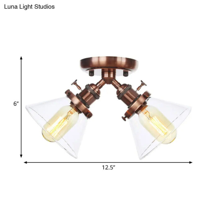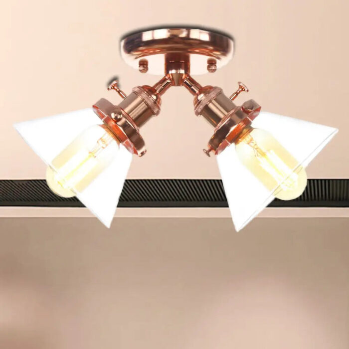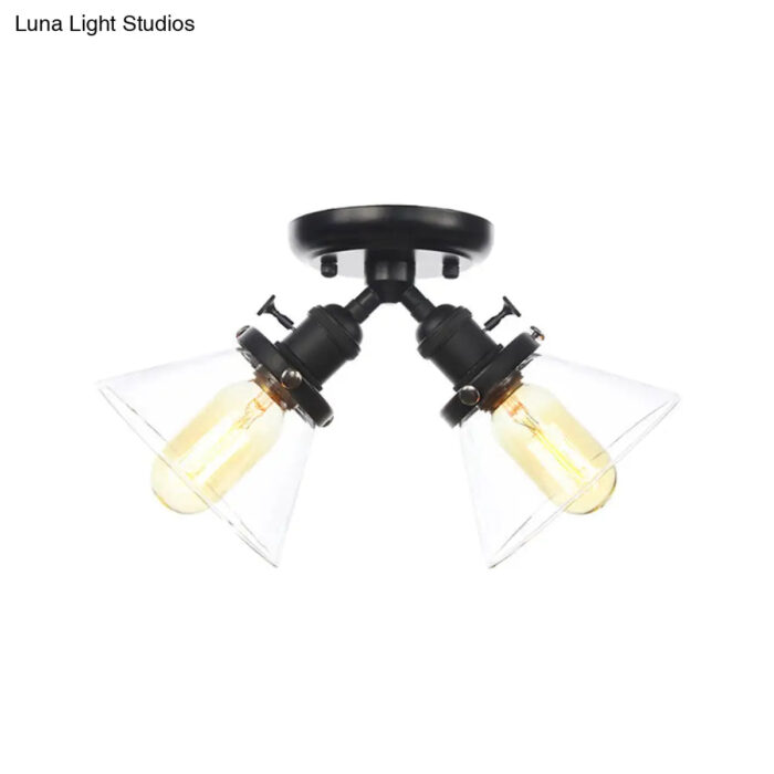 This 2 Heads Restaurant Ceiling Light Fixture is a vintage style light fixture that is semi flush mounted. It comes in black or bronze and has conic amber or clear glass shades. The light is LED, incandescent, or fluorescent. It is 110V-120V or 220V-240V. The base is E26/E27.