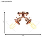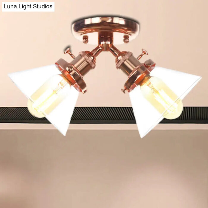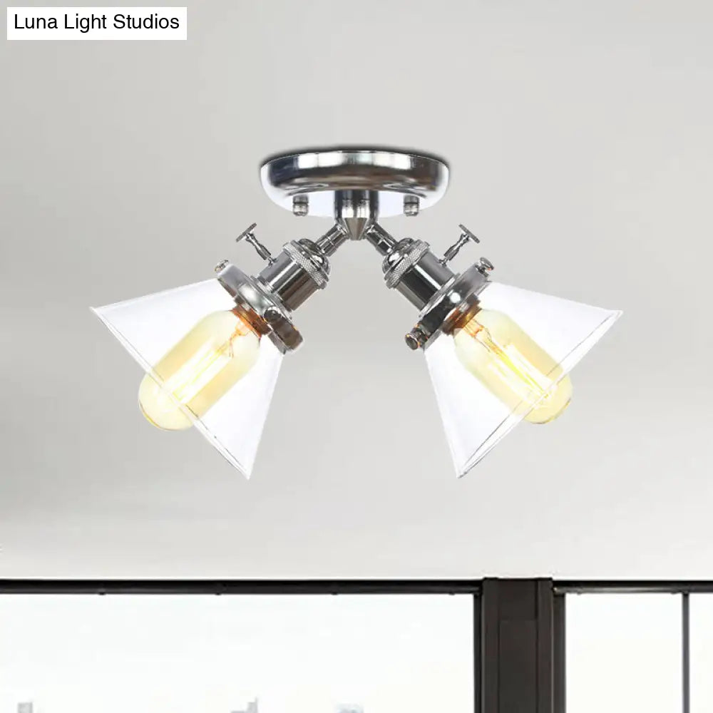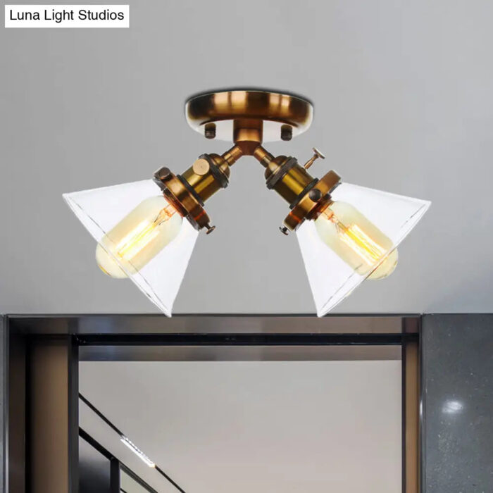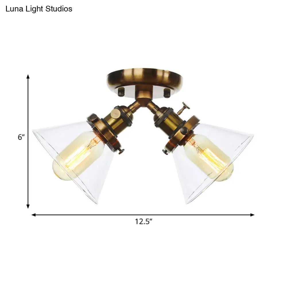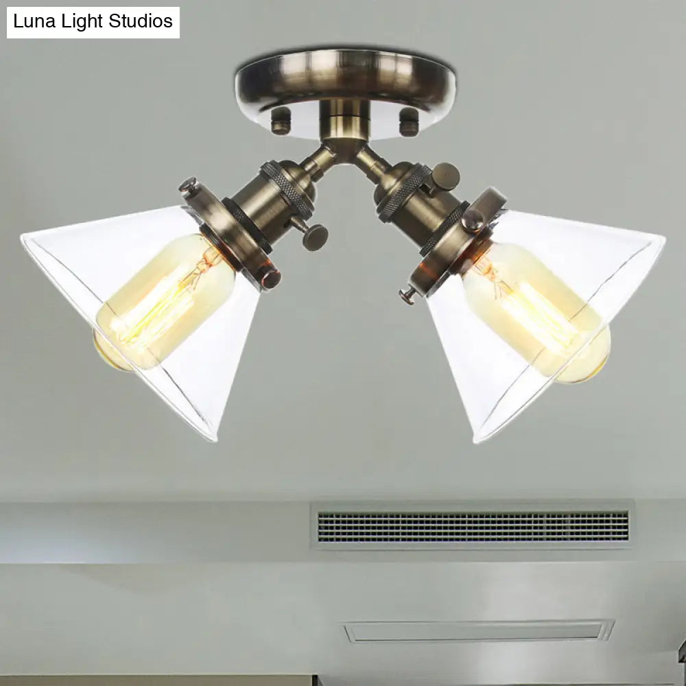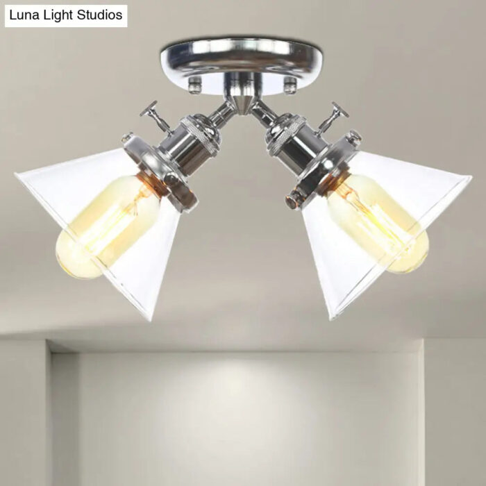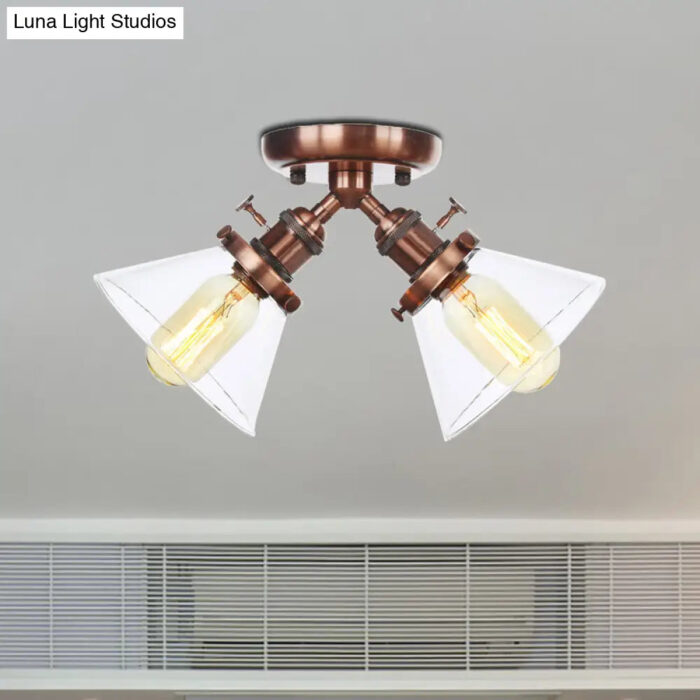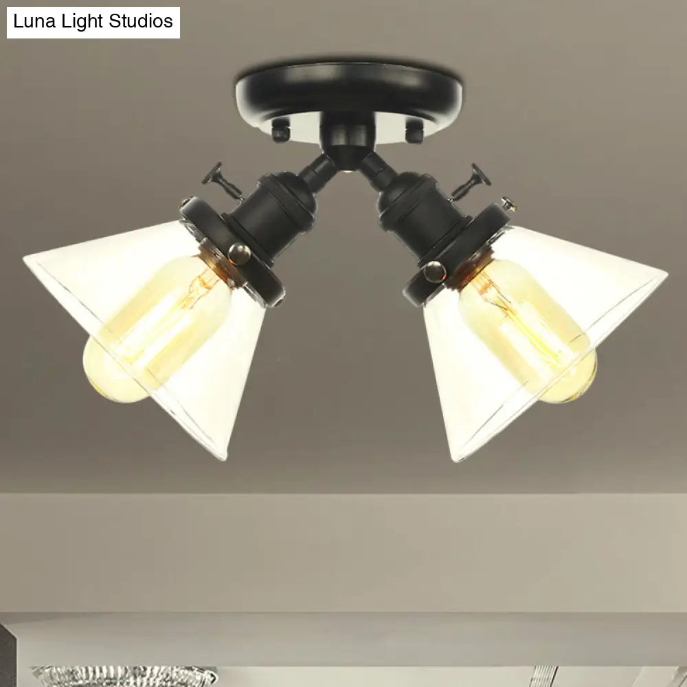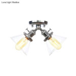 This 2 Heads Restaurant Ceiling Light Fixture is a vintage style light fixture that is semi flush mounted. It comes in black or bronze and has conic amber or clear glass shades. The light is LED, incandescent, or fluorescent. It is 110V-120V or 220V-240V. The base is E26/E27.