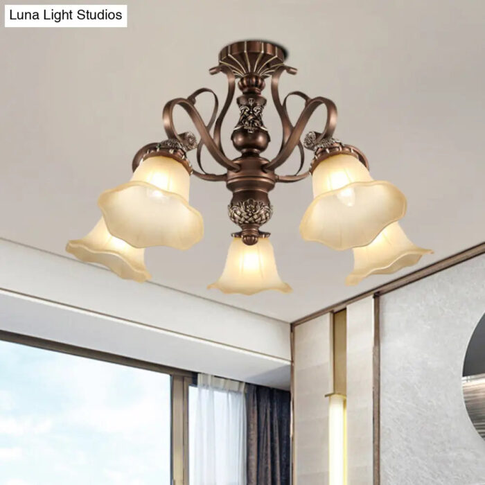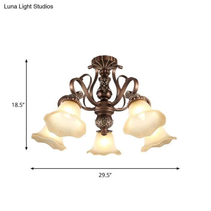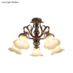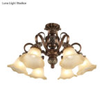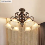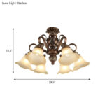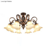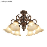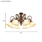 This is a 5/6/8 light chandelier with a floral design. It is made of brown opal glass and is 18.5′ high. The fixture width is 29.5′ to 35.5′ and the voltage is 220V to 240V. It uses an E26/E27 bulb base and can use LED, incandescent, or fluorescent bulbs.